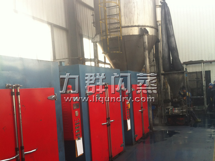 經換熱器加熱后的潔凈空氣被鼓入進風口,以適宜的速度旋入干燥室底部的環隙,然后按切線方向進入干燥室,并呈螺旋狀上升:同時,物料則由可無級調速的加料器定量加入塔內。在干燥塔內,物料與熱空氣進行充分、高效的質熱變換,被干燥的粉狀物料隨同熱風一起輸送至分離器,其中成品收集包裝,而尾氣則進一步經除塵裝置處理后排空。