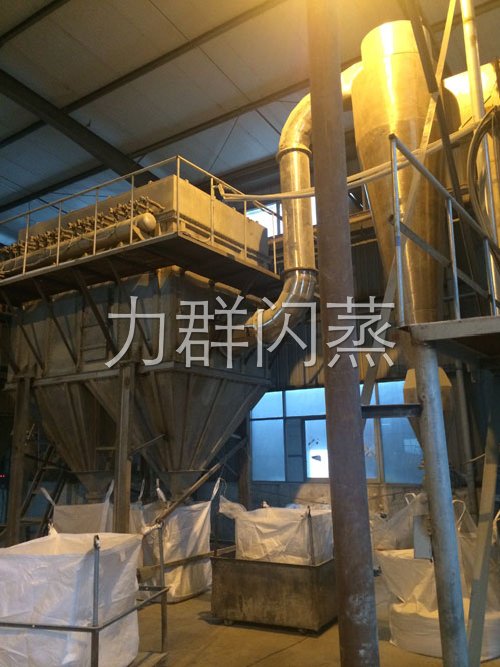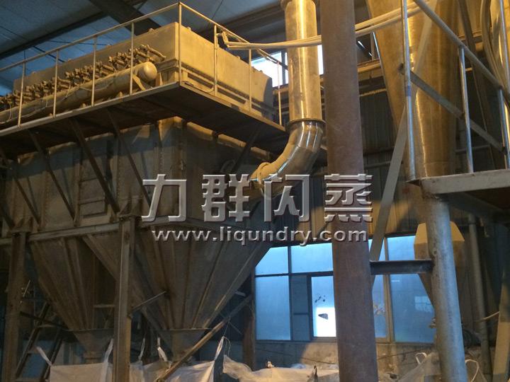 經(jīng)換熱器加熱后的潔凈空氣被鼓入進風(fēng)口,以適宜的速度旋入干燥室底部的環(huán)隙,然后按切線方向進入干燥室,并呈螺旋狀上升:同時,物料則由可無級調(diào)速的加料器定量加入塔內(nèi)。在干燥塔內(nèi),物料與熱空氣進行充分、高效的質(zhì)熱變換,被干燥的粉狀物料隨同熱風(fēng)一起輸送至分離器,其中成品收集包裝,而尾氣則進一步經(jīng)除塵裝置處理后排空。